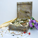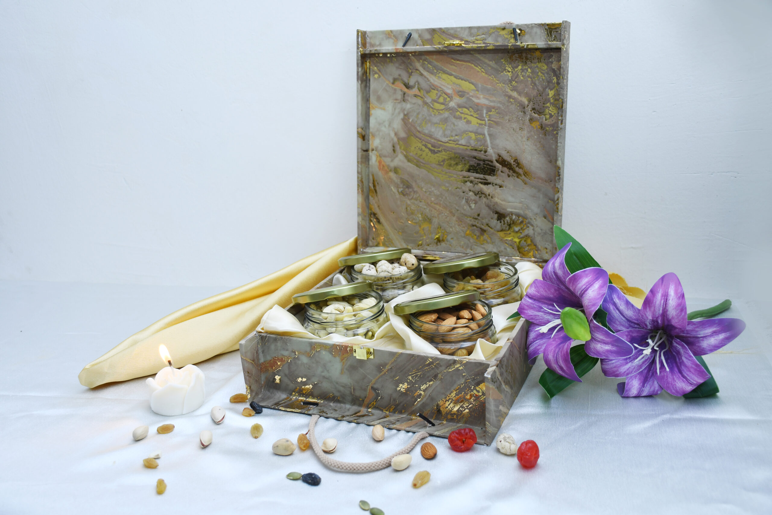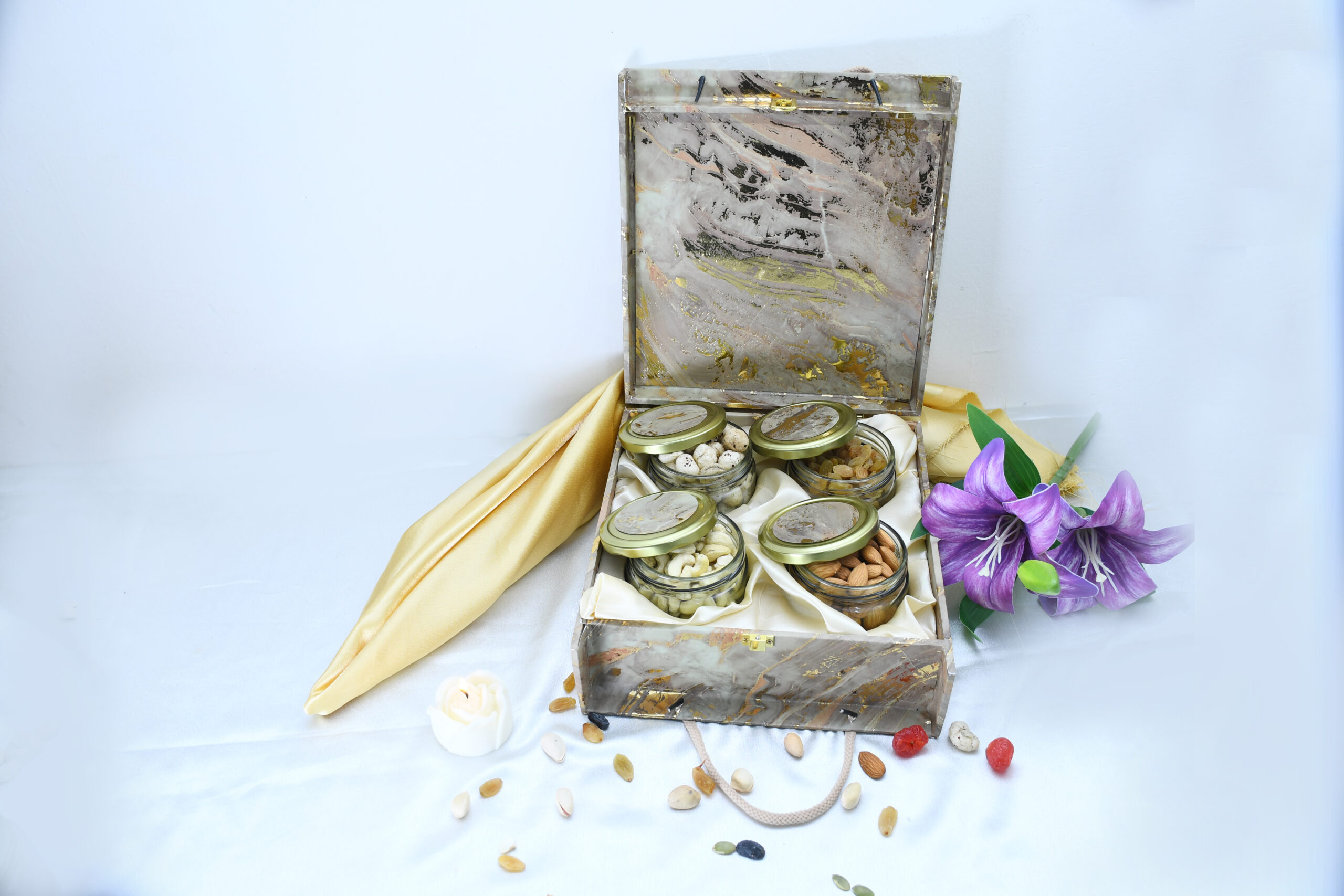 Luxury grenite-style MDF box with four jars featuring roasted makhana, kismis, mix seeds, and cashews.