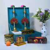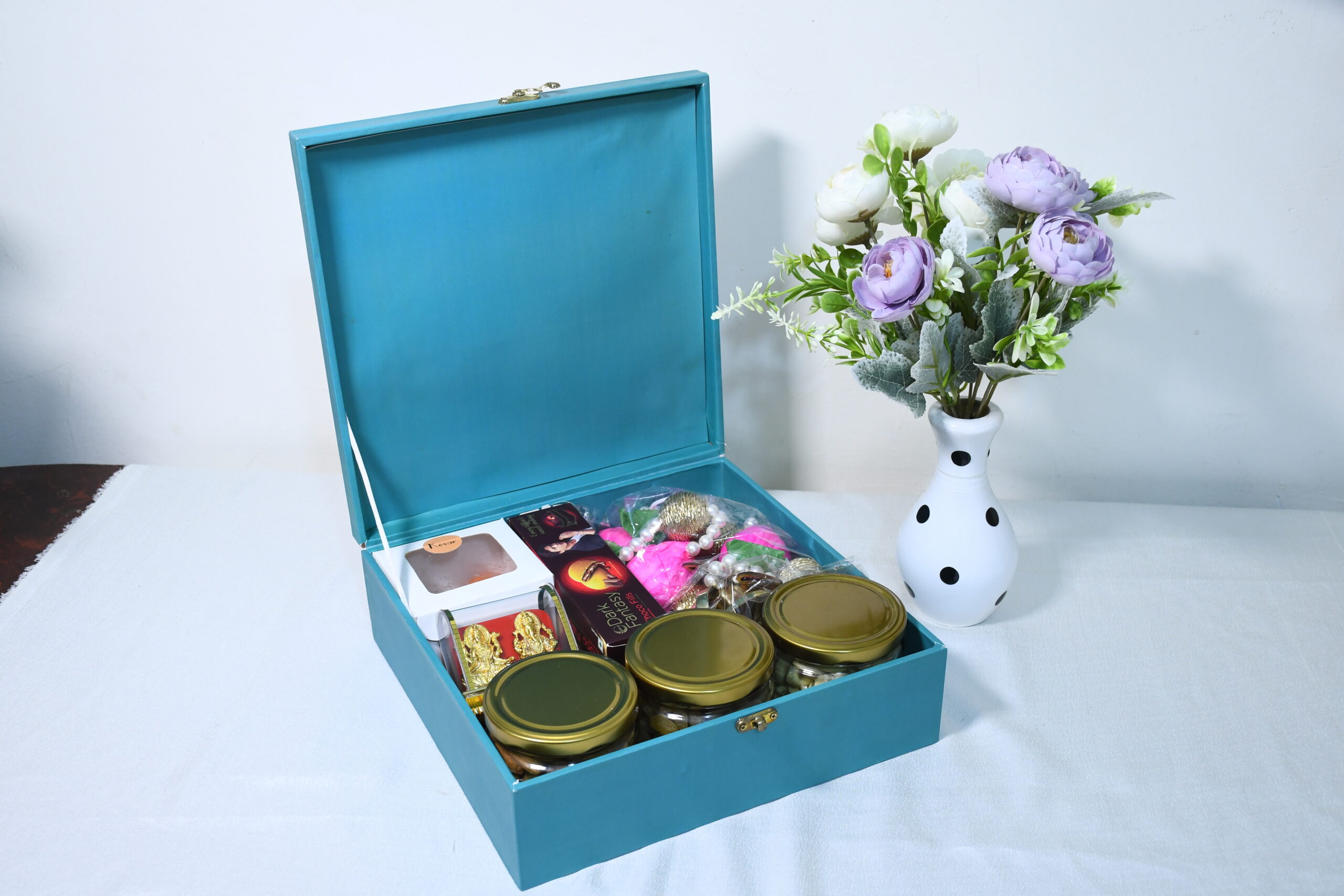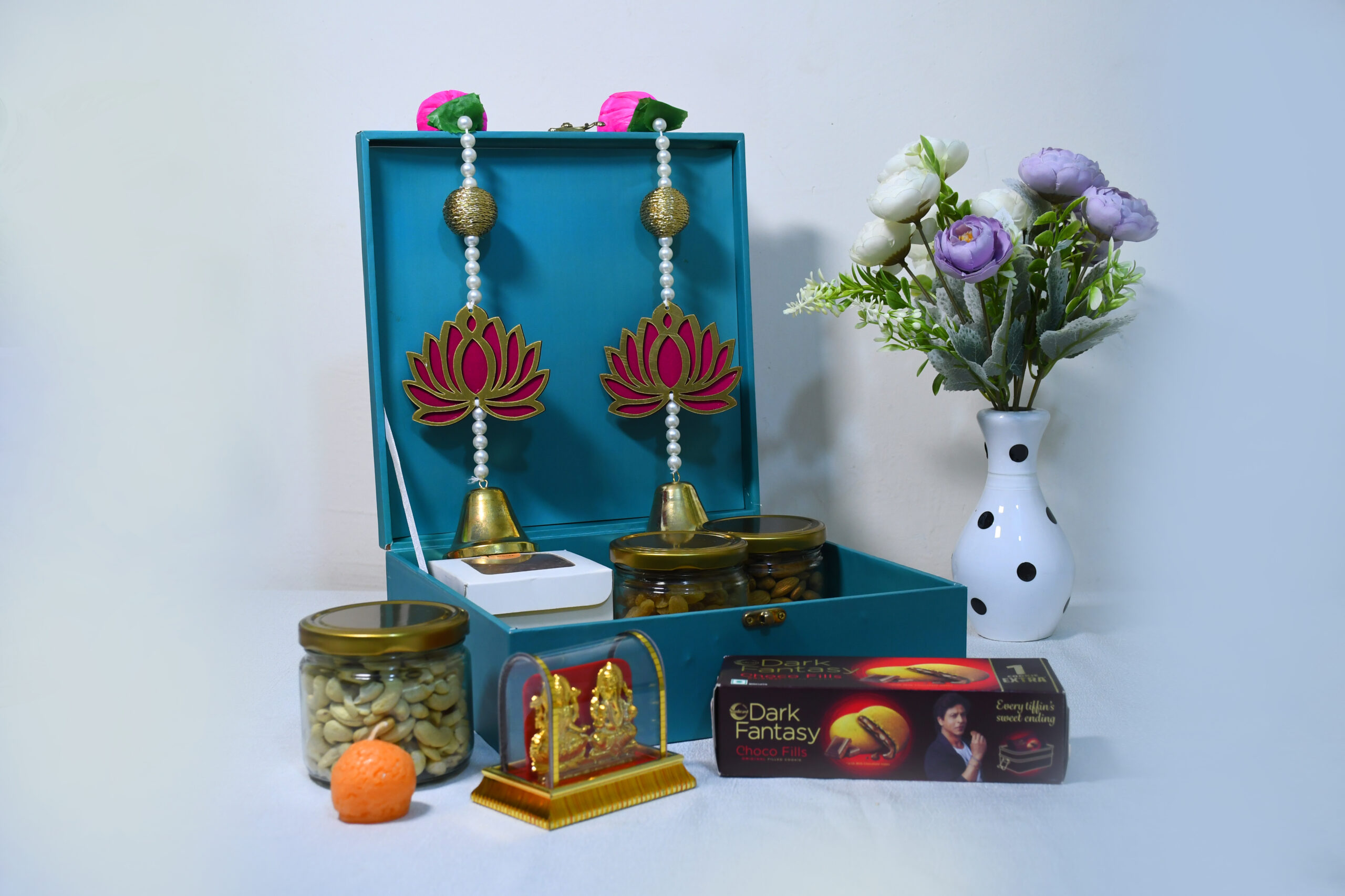 Blue box with dry fruits, candles, lotus latkan, murti, and chocolates.