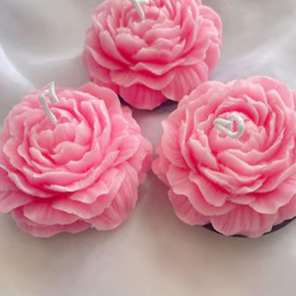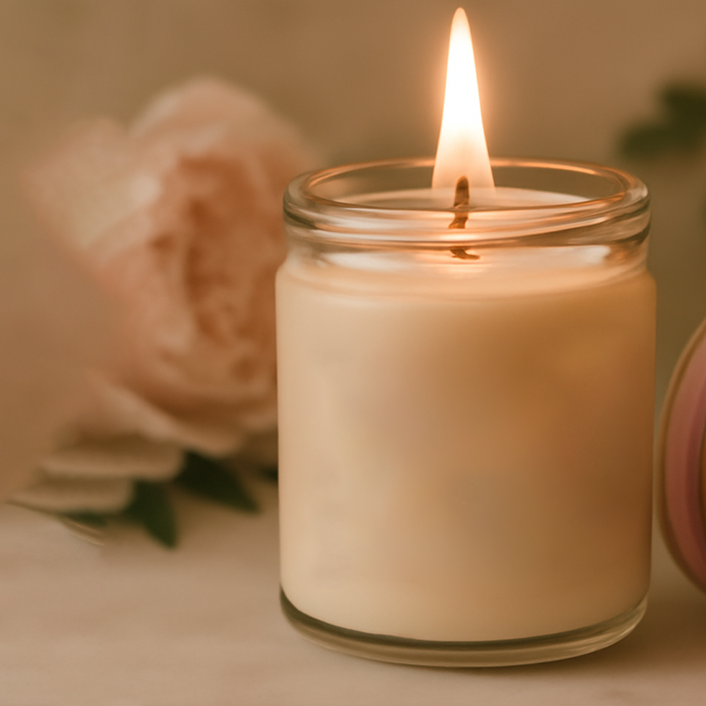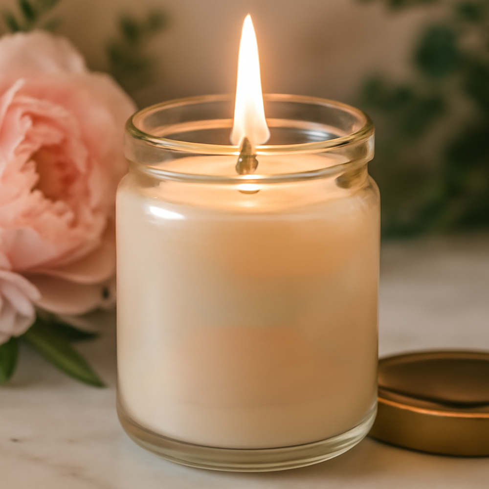 Scented borosile jar candle with wooden lid, with peony flower on top_Peony Fragrance