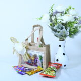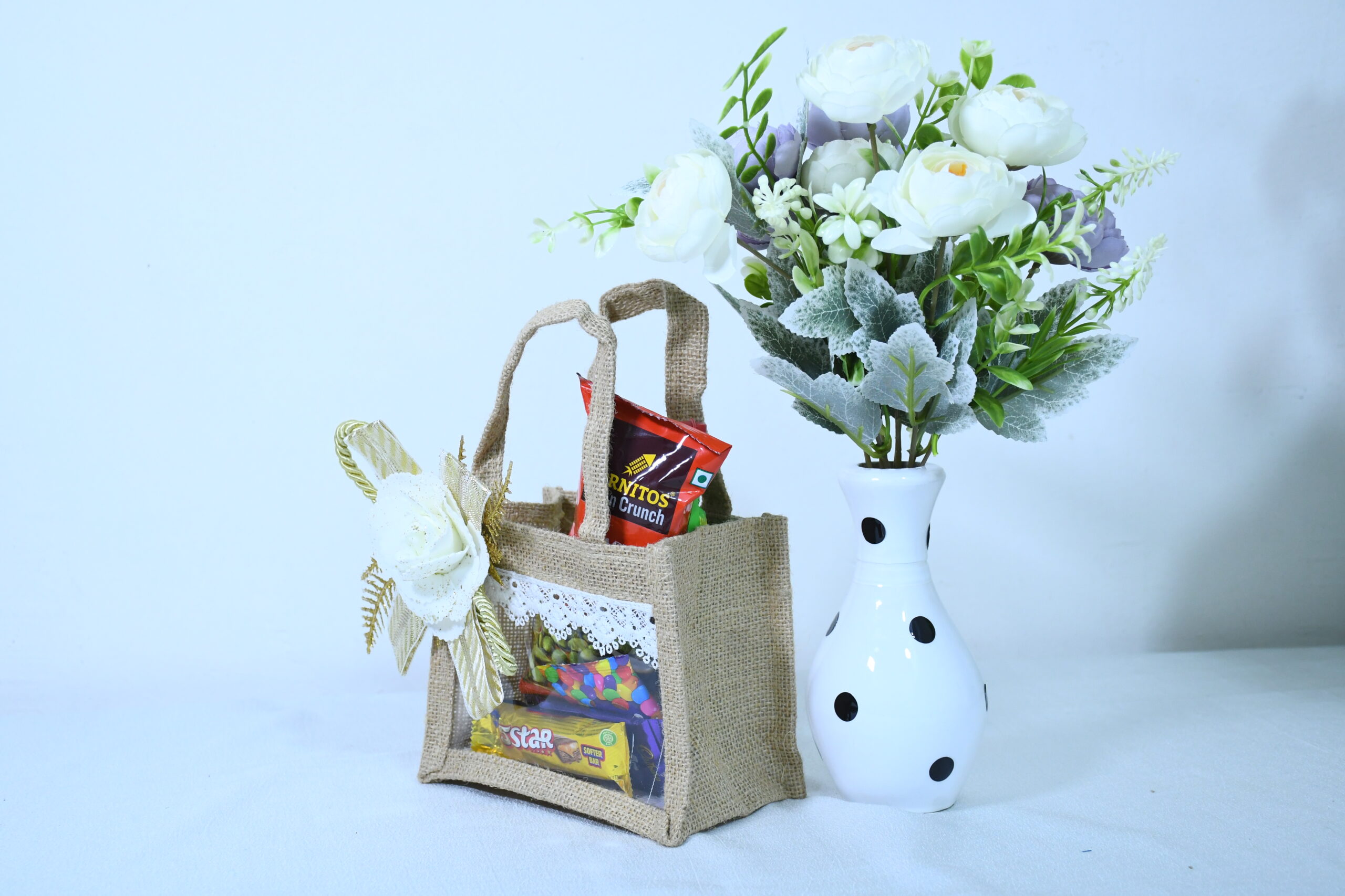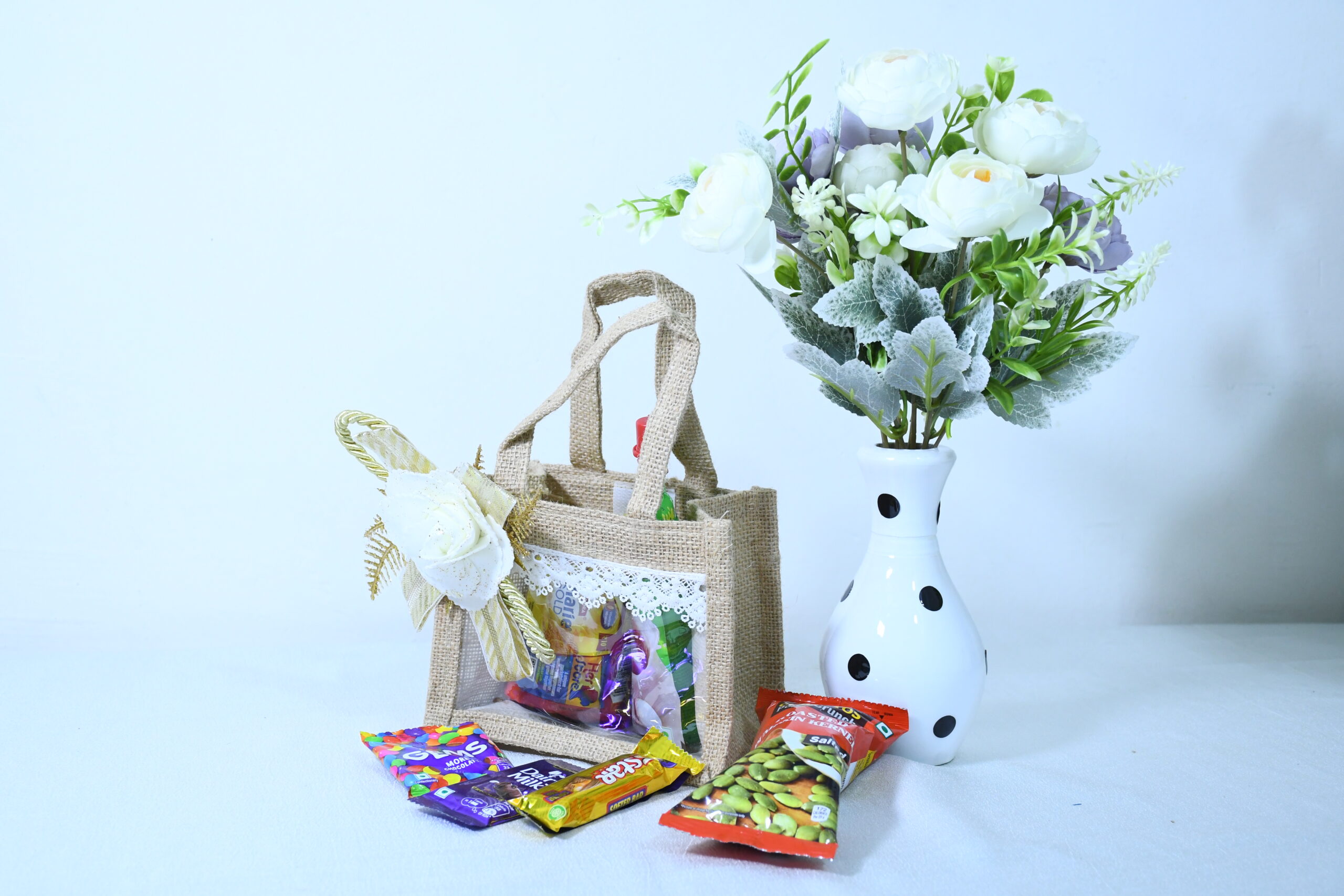 Hand jute bag with chocolates, biscuits, and beverage for gifting.