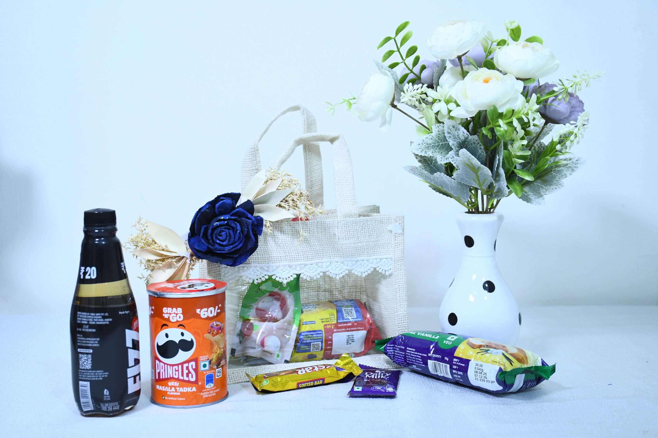 Hand white jute bag with cookies, cake, chocolates, and beverage.