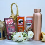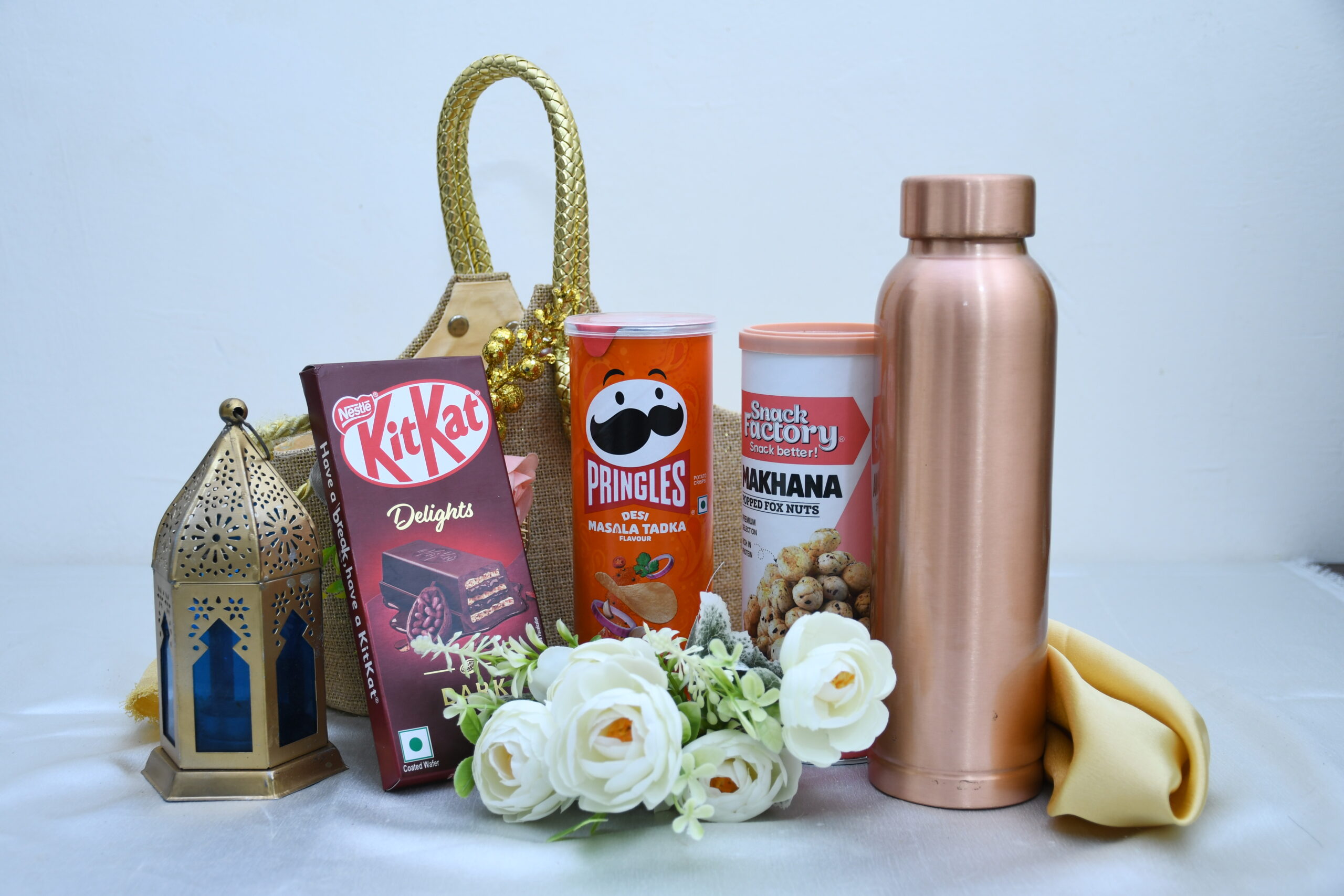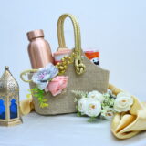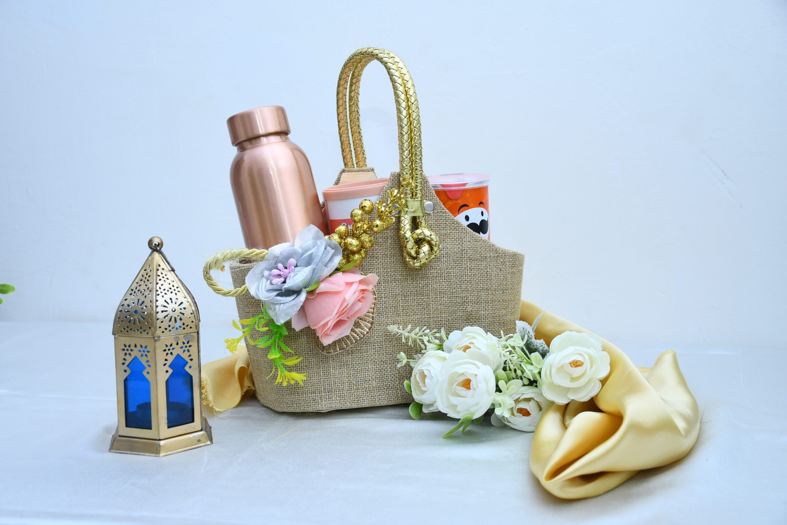 This Jute Gold Purse Snack Hamper is a compact and elegant gift option. It includes savory snacks packed in a stylish jute gold purse, perfect for gifting on special occasions or corporate events.