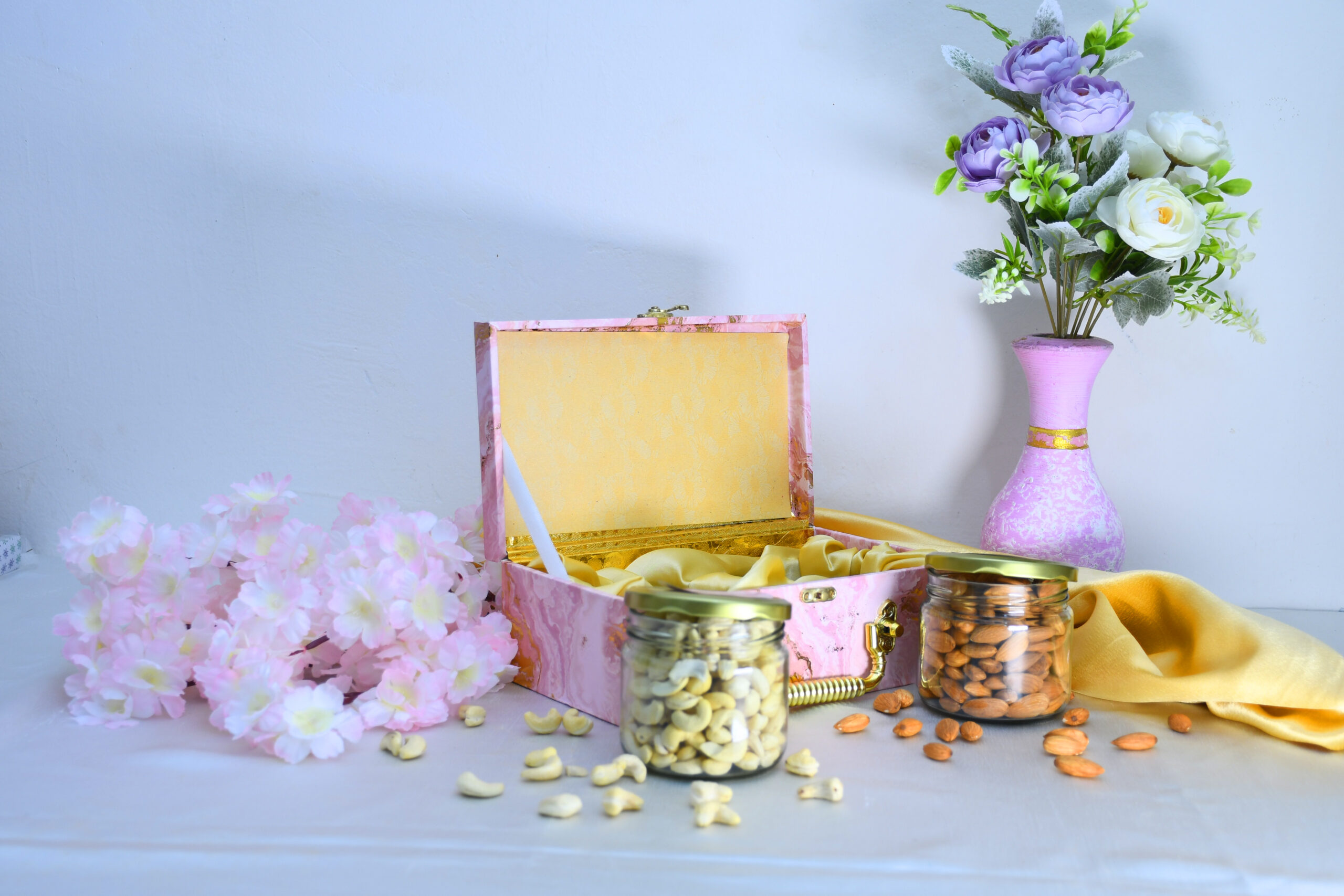 Stylish pink MDF box with two jars of cashews and almonds, designed for contemporary Diwali gifting and corporate branding.