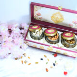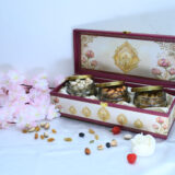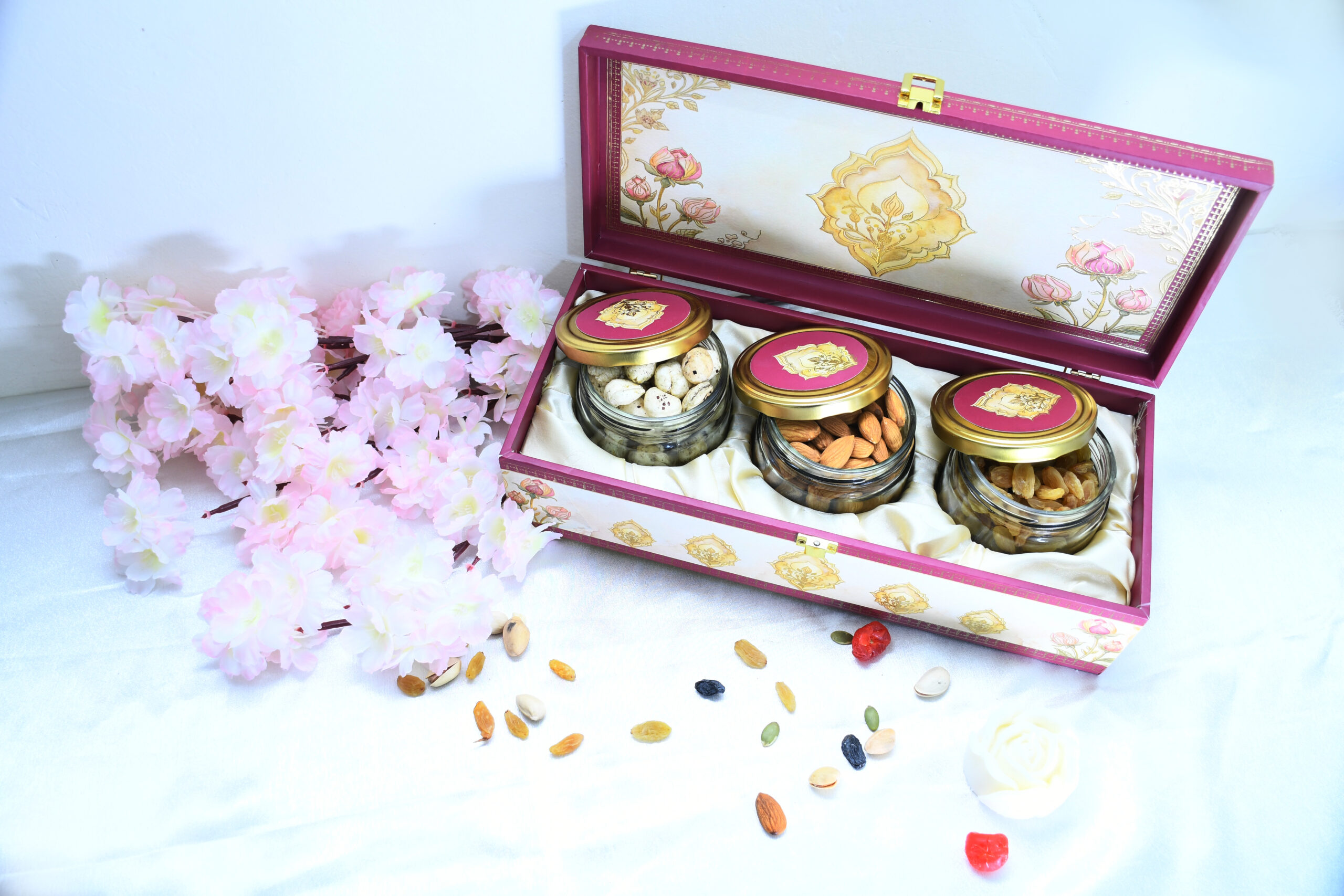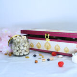 Stylish pink and white MDF box with three jars of nuts and seeds for modern Diwali gifting.