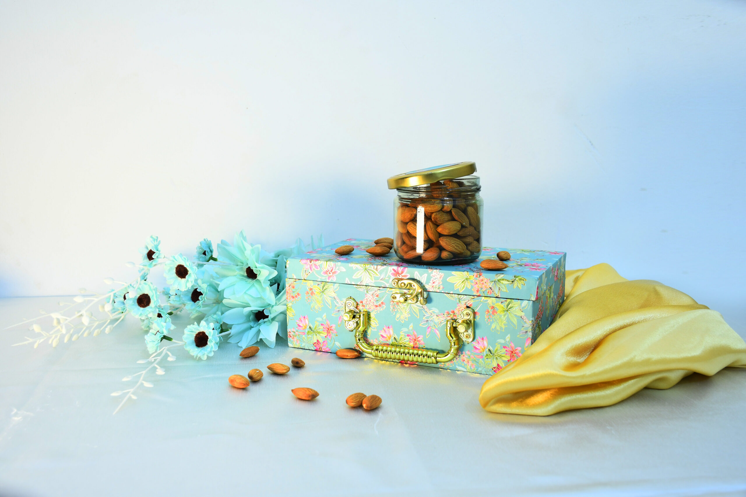 Elegant MDF floral printed box with two jars of premium cashews and almonds – perfect for festive and corporate gifting.