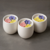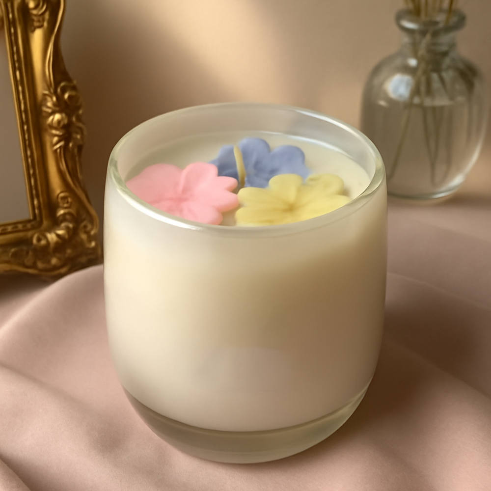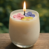 Bring home elegance and floral beauty with our Scented Designer Flower Jar Candle. This unique candle is presented in a sleek, rounded white jar and adorned with delicately crafted wax flowers in soft pastel hues. Measuring 2.5 x 2.5 inches and filled with the classic, soothing scent of rose, this luxury candle offers more than 15 hours of aromatic ambiance. Its enchanting look and exquisite fragrance make it the perfect choice for gifting, relaxing evenings, or stylish décor accents.