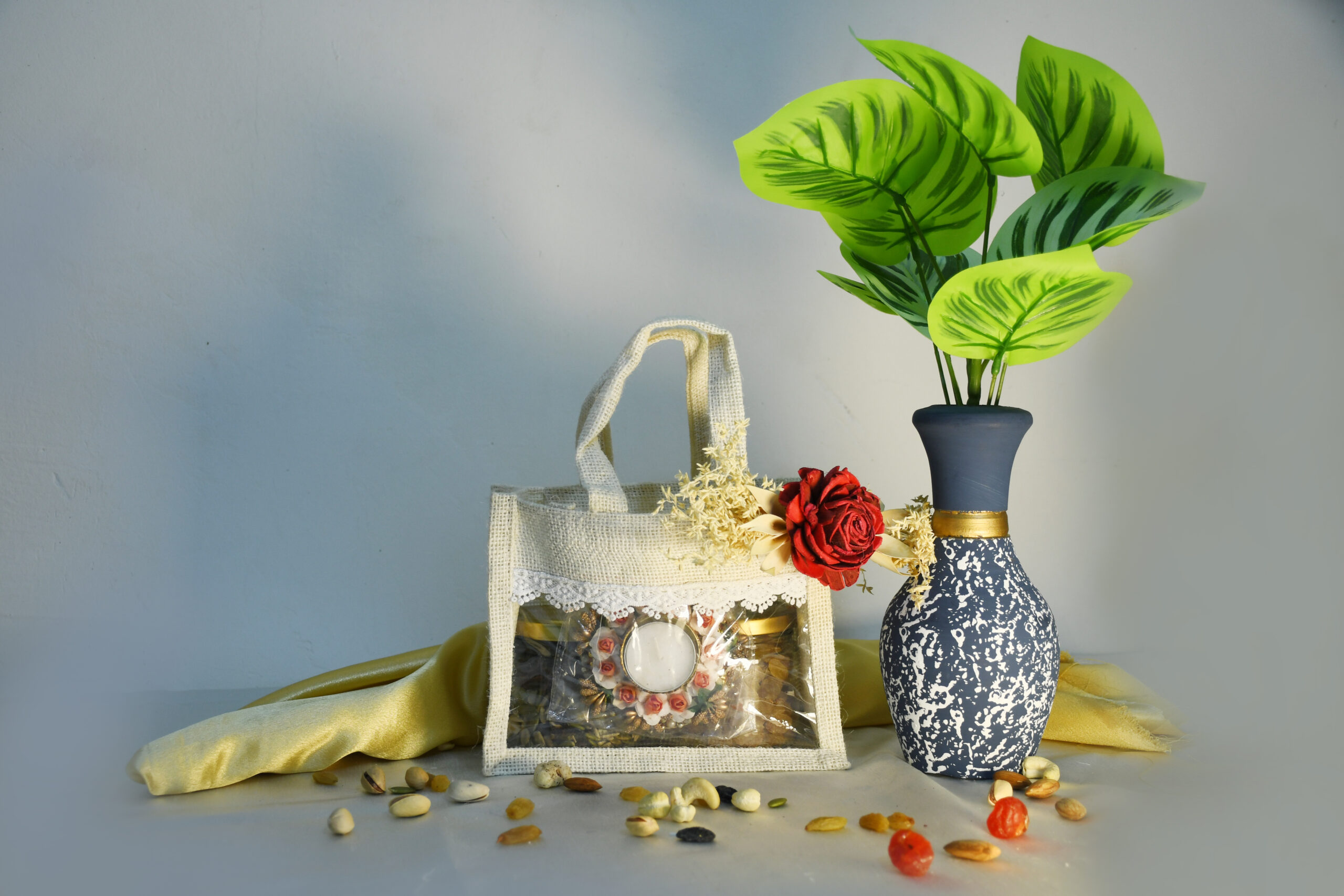 Stylish white jute bag with 2 jars of dry fruits, perfect for gifting.