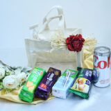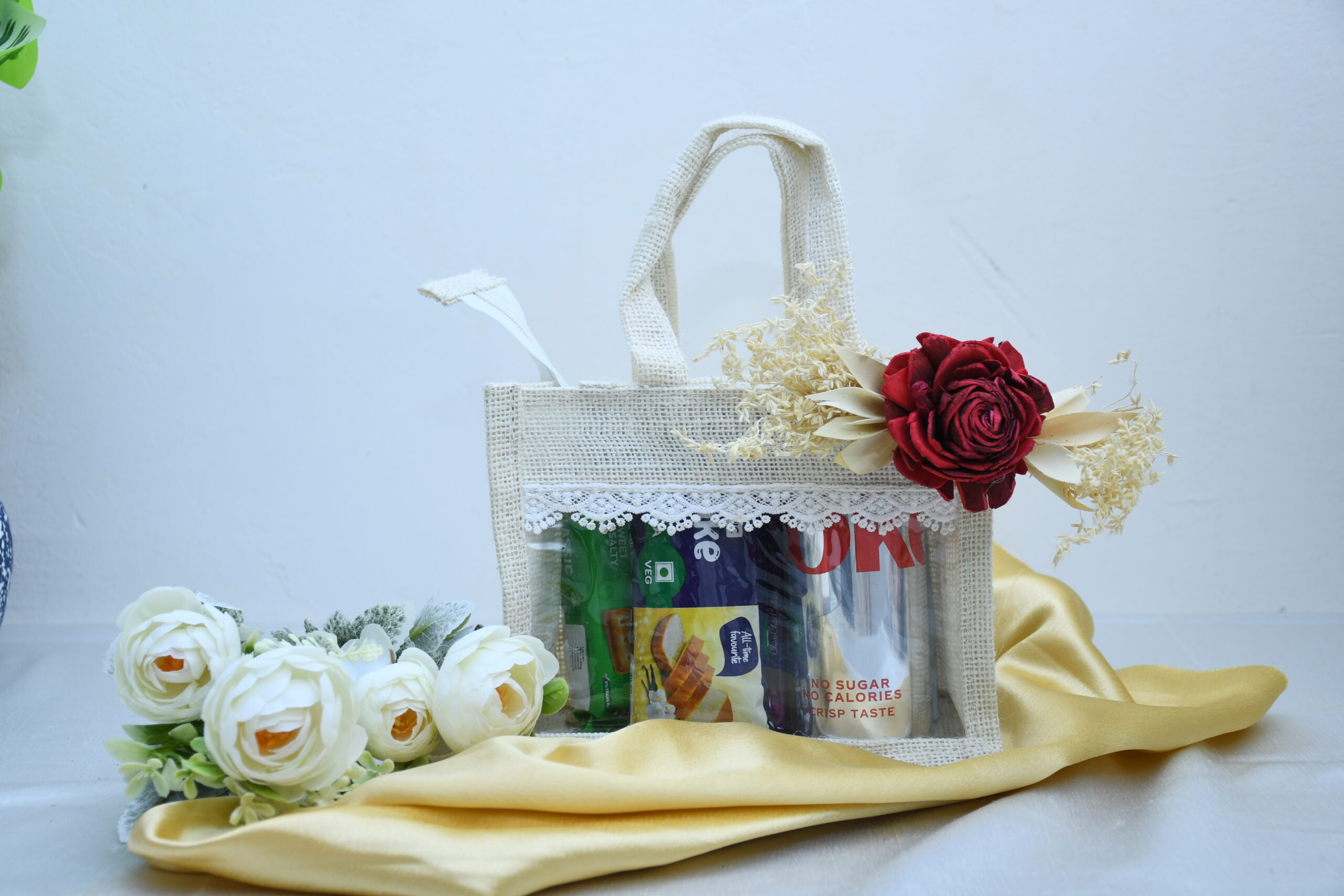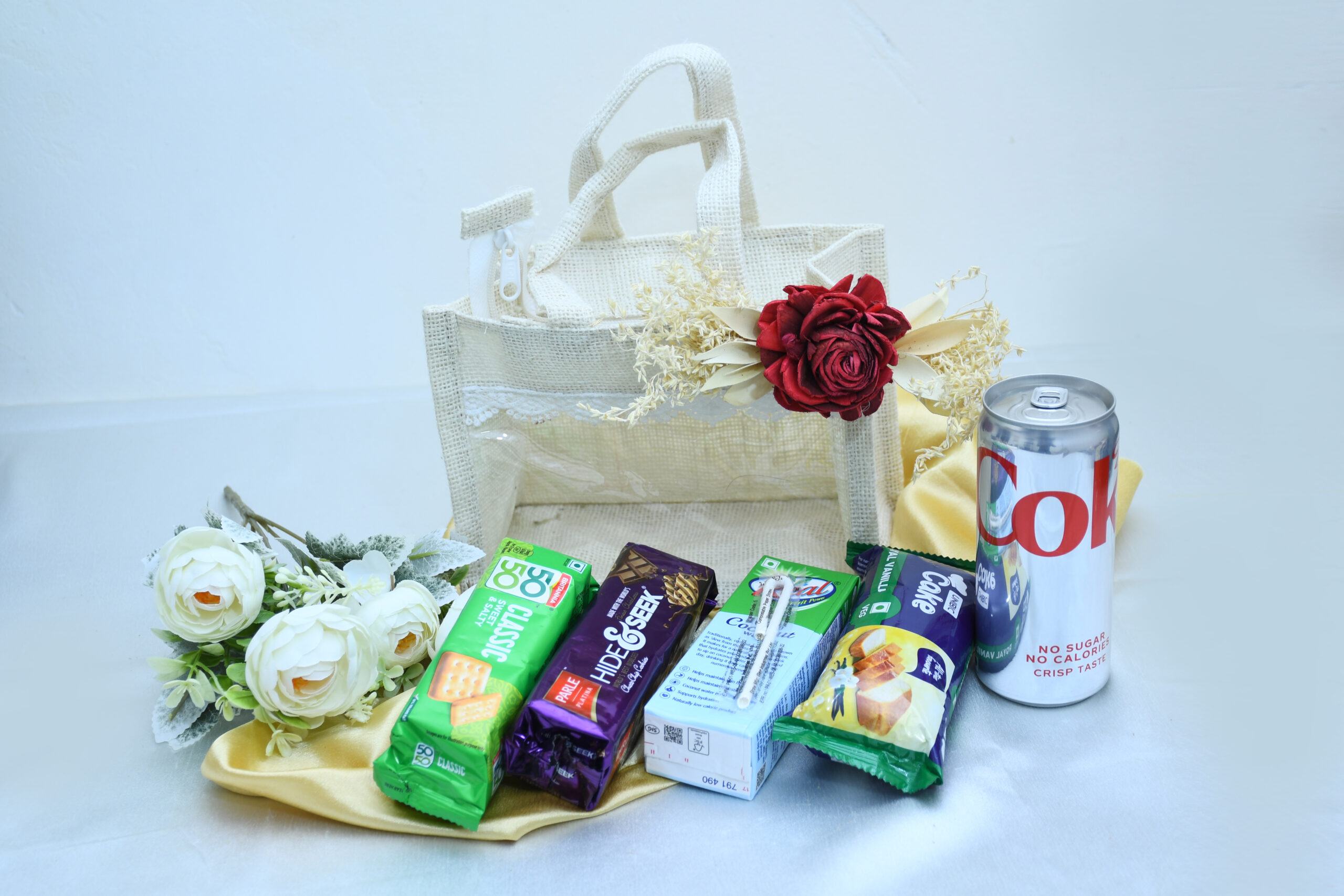 White jute bag with biscuits, cake, coconut water, and Diet Coke – perfect for gifting.